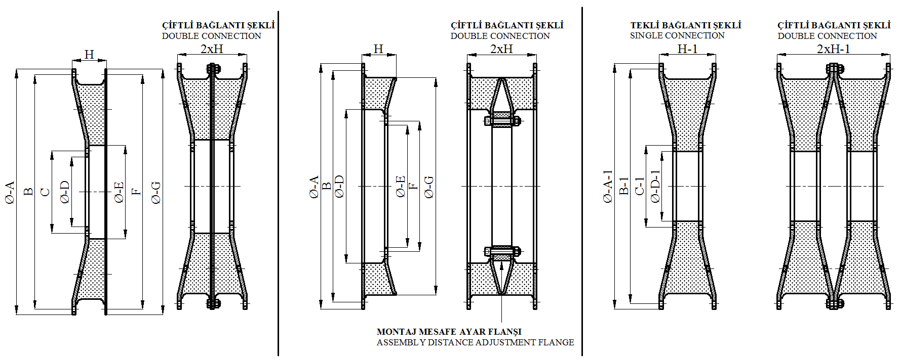 | Ø-A | B | C | Ø-D | Ø-E | F | Ø-G | H (mm) | 2xH | Ø-A-1 | B-1 | C-1 | Ø-D-1 | H-1 (mm) | 2xH-1 |