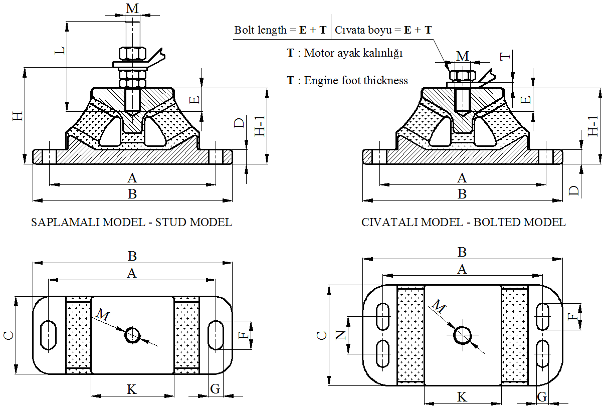 Aşağıdaki detay ölçülerindede görüleceği gibi köprü sistemi ayaklar ve destek lastikleri ile kuvvetlendirilmiştir.ürün kodlarımız şu şekilde ifade edilir; “E: vibrasyon takozunun bağlantı ekseni mm ve inch şeklinde ifade edilir.”